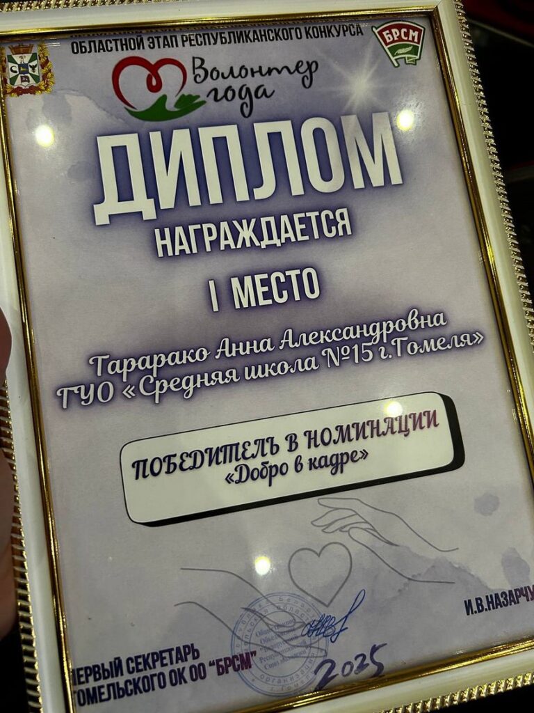 И мы с радостью и огромной гордостью объявляем: Дипломом I степени в номинации «Добро в кадре» награждена наша путеводная звезда — руководитель волонтёрского отряда «Добрые сердца» ГУО «Средней школы №15 г.Гомеля» Анна Александровна Тарарако!