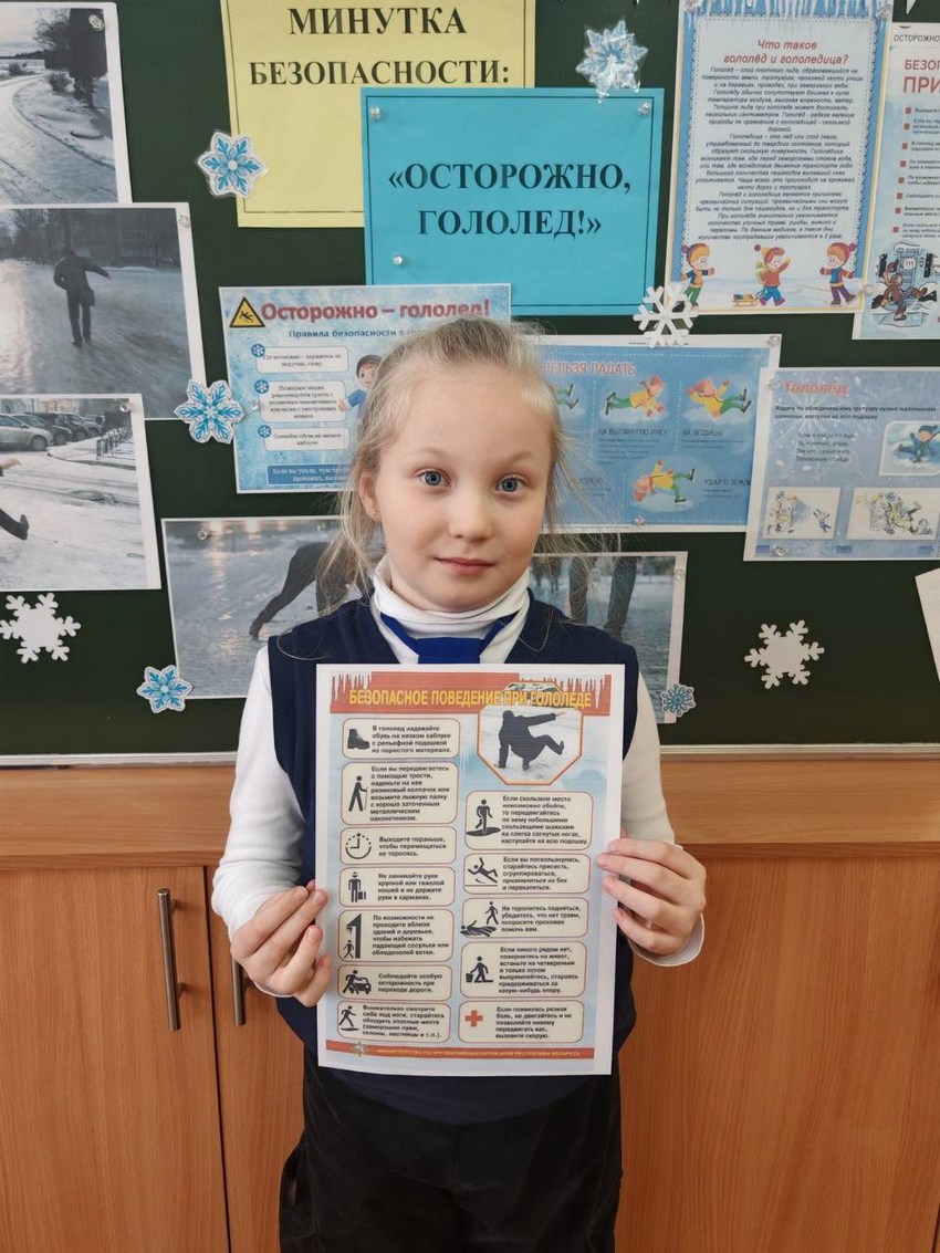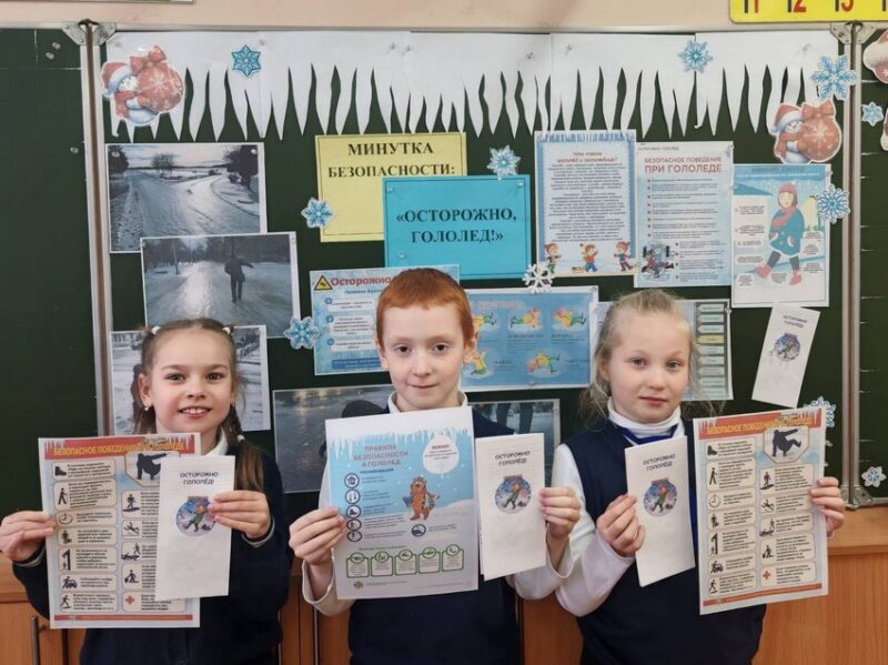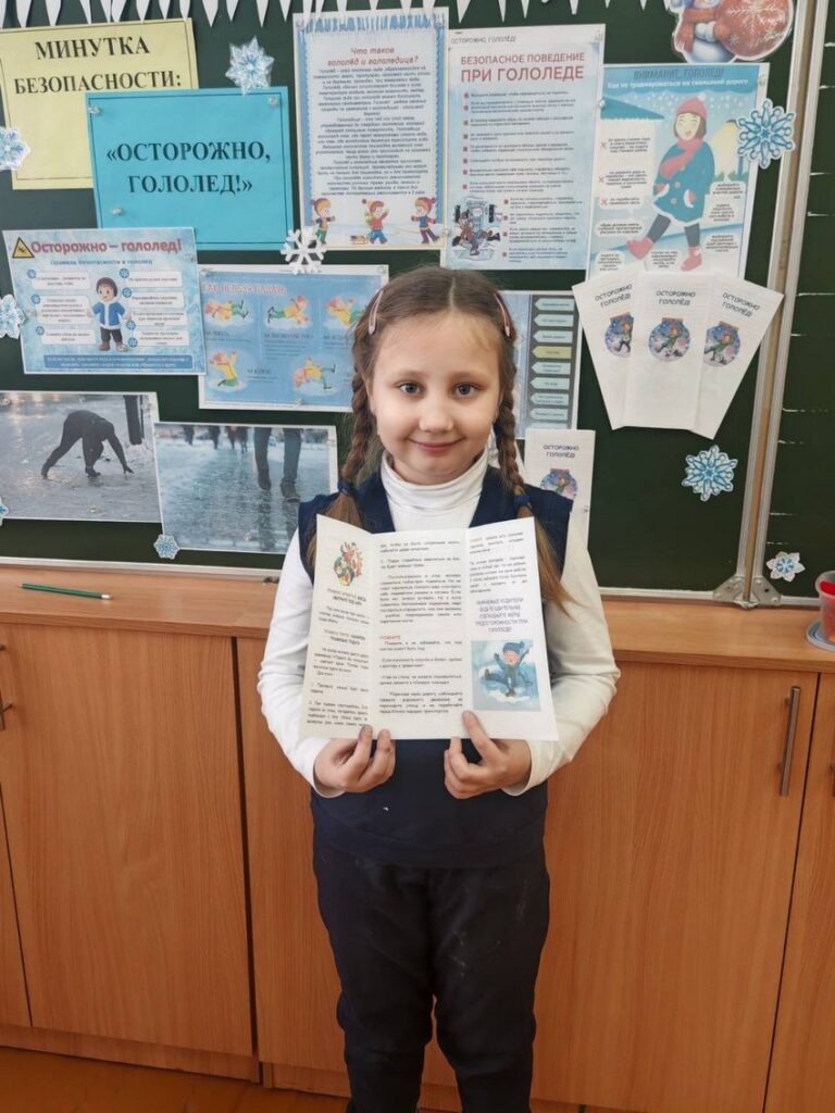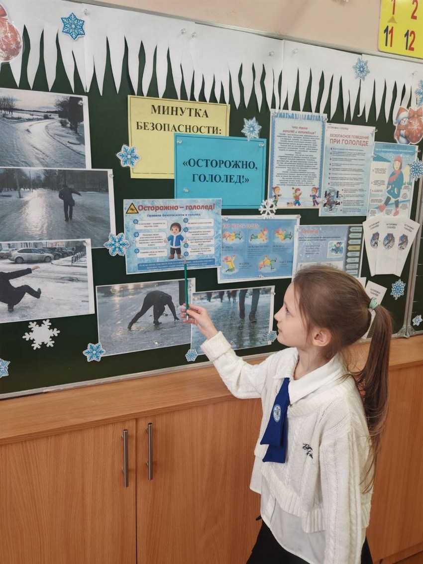 В рамках занятия — Минутка безопасности «Осторожно, гололед!» учащиеся узнали, как правильно передвигаться по скользкой поверхности, чтобы минимизировать риск падения, какую обувь лучше всего выбирать для зимней погоды, как оказать первую помощь при падении и травме, как правильно подготовить свой дом и двор к гололеду, о мерах профилактики травм.